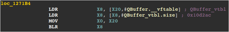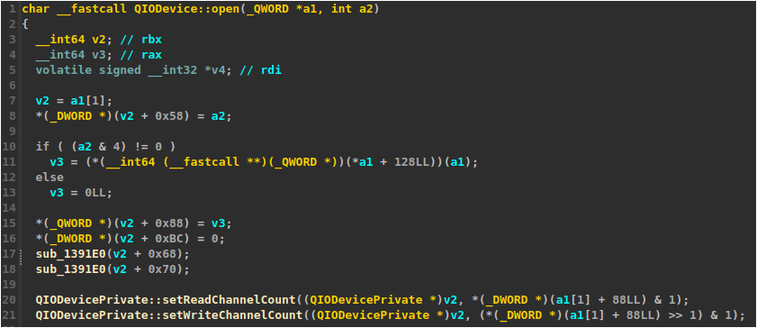 v2 (a QIODevicePrivate object). We also see an indirect call at line 11 to one of QIODevice’s virtual methods.