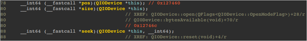 After hitting the “Propagate” button, QIODevice will be reconstructed from the given entry point. Its virtual table, loaded after the entry point, will be identified and reconstructed. All virtual methods are also analyzed, as “Spread in callees” was checked. If we look at the reconstructed QIODevice_vtbl fields, we find our previous size() virtual method with a cross-reference on it, showing it is indeed used in QIODevice::open().