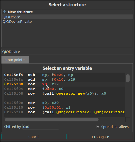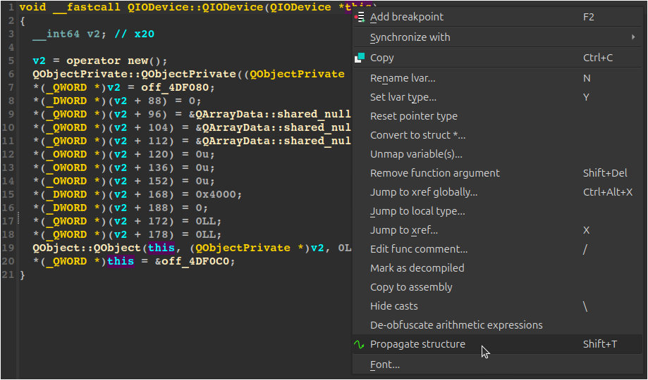 To illustrate, suppose we are again reversing QtCore, but did not run the pre-analysis. After stumbling on the QIODevice class, we want to reconstruct it and its virtual table automatically. For this, we place ourselves in its constructor, where it is initialized. From there, we select an entry line for the data-flow and use the “Propagate structure” option from the context menu that opens on right-click: